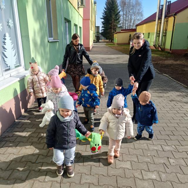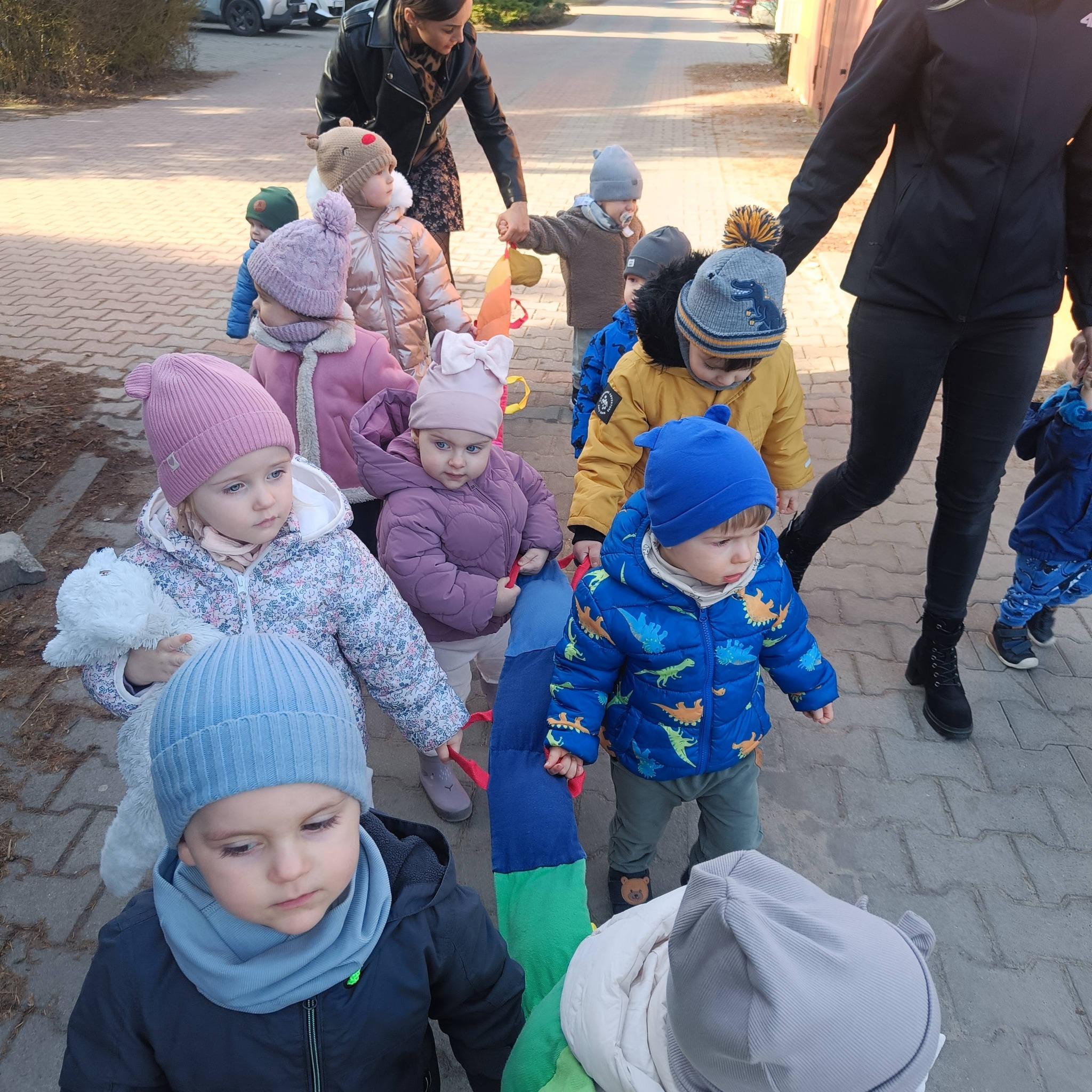Maluchy podziwiały otaczającą nas przyrodę, powoli budzącą się do życia. Odwiedziły również pieska i kotka . Są to zwierzątka mieszkające na terenie naszego żłobka. W spacerze pomógł nam kolorowy przyjaciel wąż, który utrzymywał dzieci w parach. Było bardzo przyjemnie a dzieci ochoczo i z uśmiechem dreptały nóżkami.