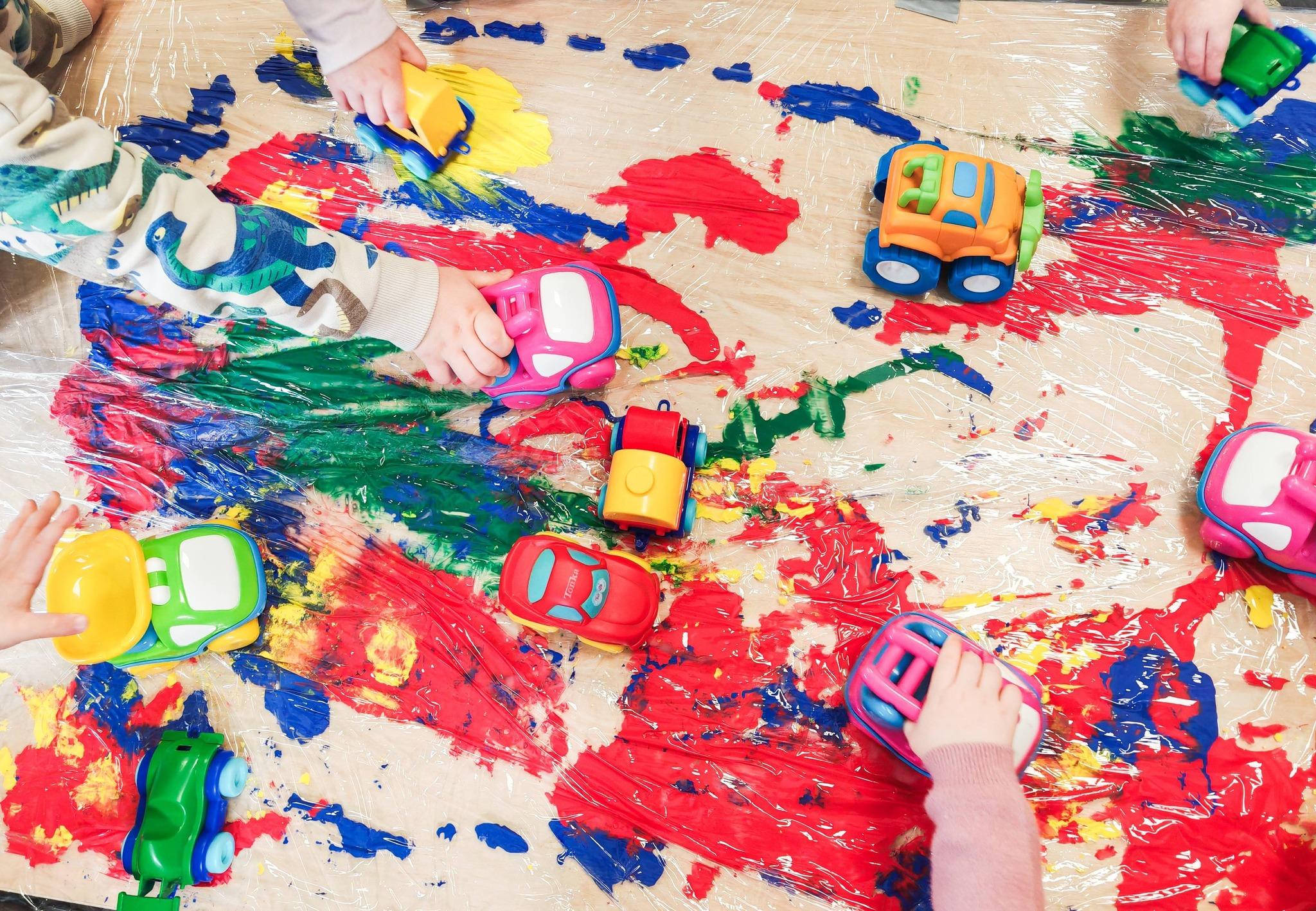 Dziś żłobkowe sówki rozwijały motorykę małą oraz koordynację ręka-oko. Zabawa ta pozwala zrozumieć zależności przyczynowo-skutkowe( jak nacisnę to zostanie ślad), wspomaga koncentrację oraz stymuluje dotyk( różne faktury: folia, farba).