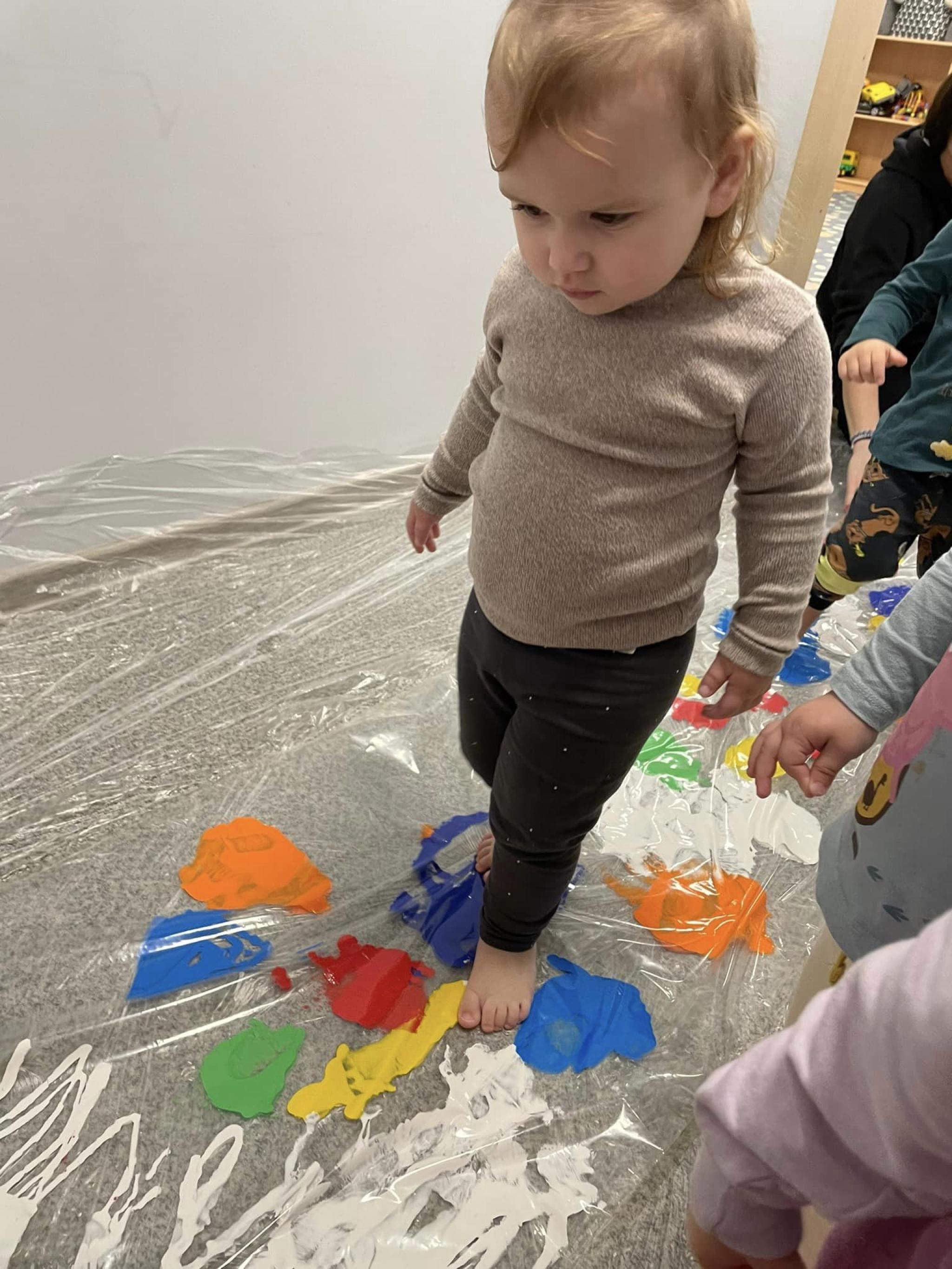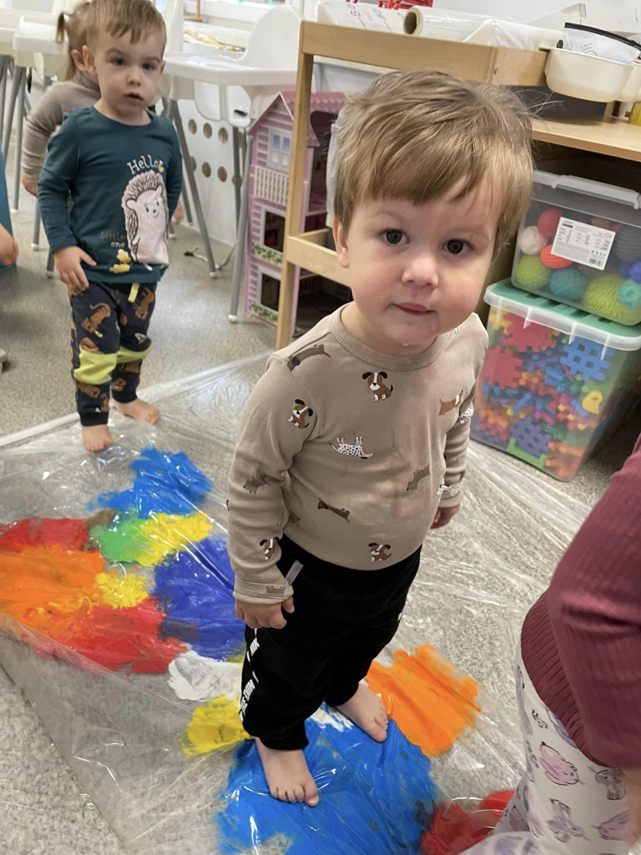 Dzieci miały okazję przyjrzeć się swoim stopom a podczas zabaw rozwijały zmysł równowagi, sprawność motoryczną i zmysł dotyku. Dzieci wykonały prace plastyczną swoimi stopami.