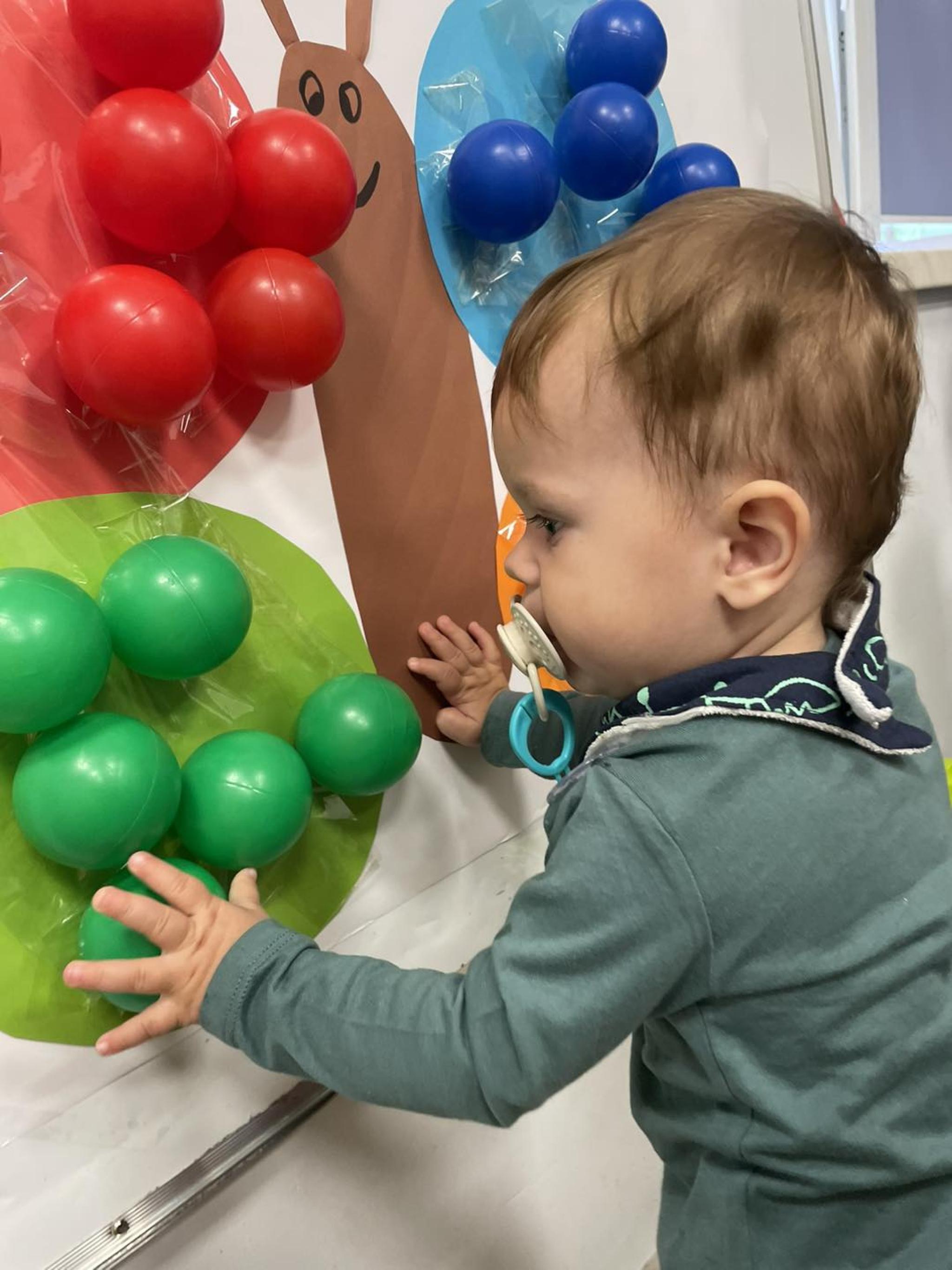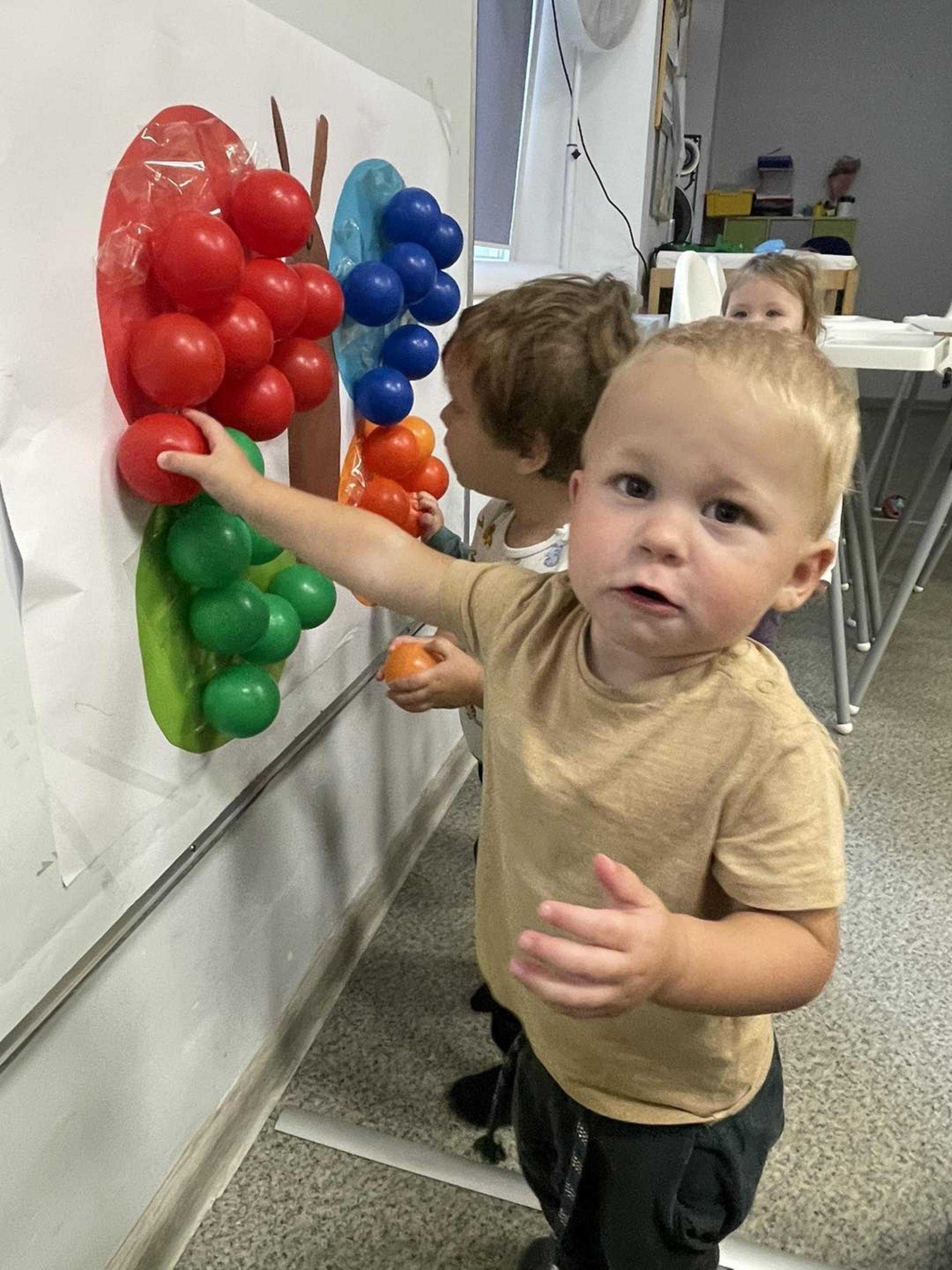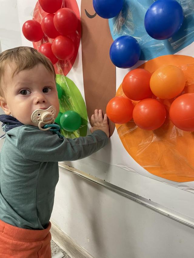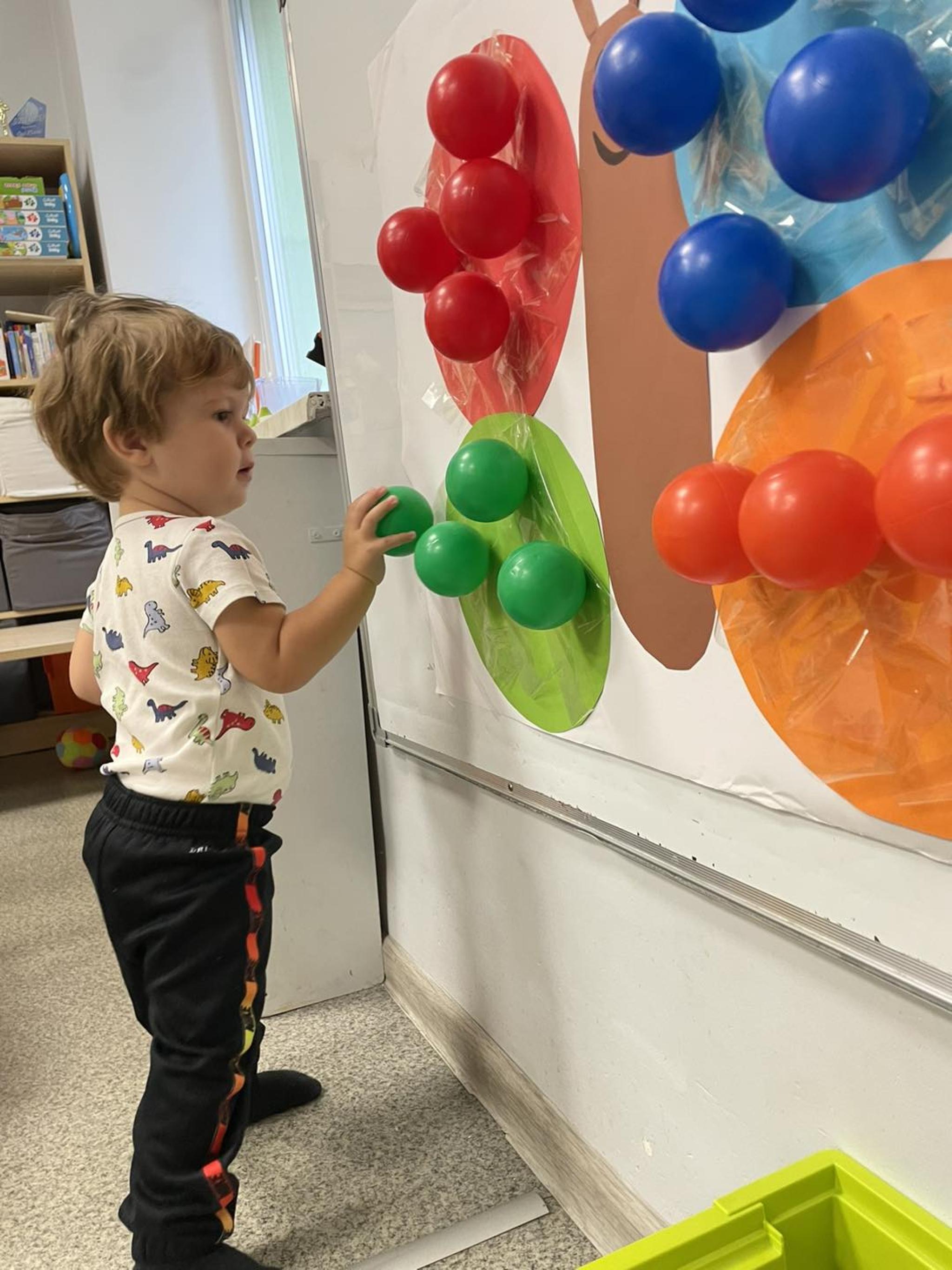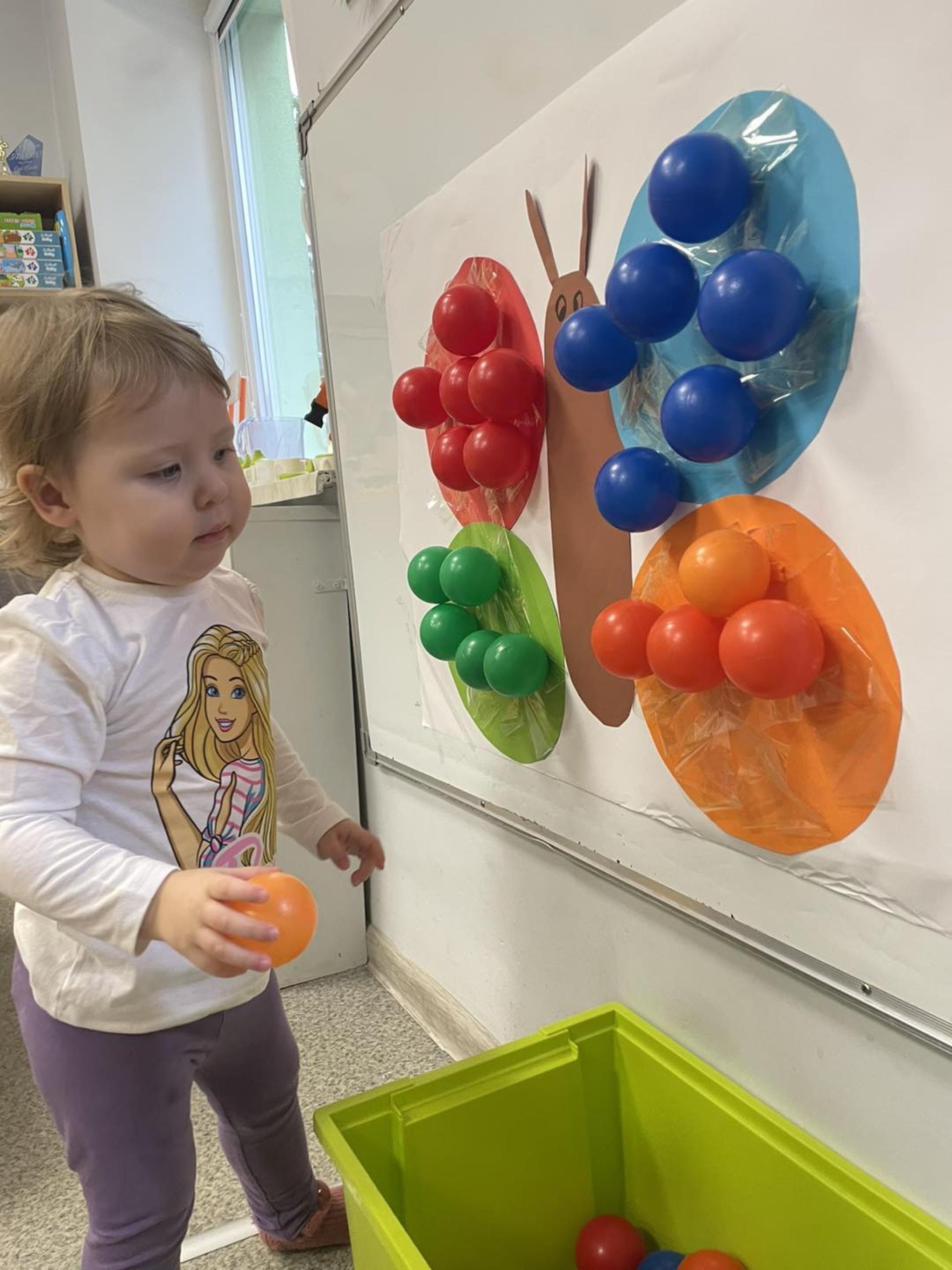 Nasze Maluszki kochają bawić się kolorowymi piłeczkami dlatego dzisiaj sówki przyklejały piłeczki do kolorowego motyla. Rozwijają dzięki tej zabawie motorykę małą, myślenie, segregowanie oraz koordynację wzrokowo-ruchową.