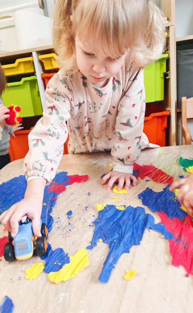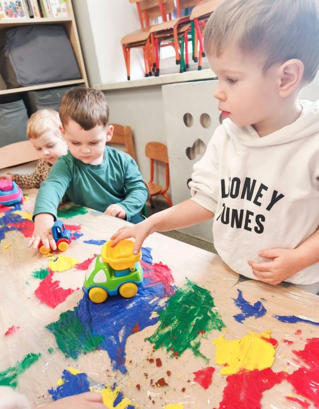 Dziś żłobkowe sówki rozwijały motorykę małą oraz koordynację ręka-oko. Zabawa ta pozwala zrozumieć zależności przyczynowo-skutkowe( jak nacisnę to zostanie ślad), wspomaga koncentrację oraz stymuluje dotyk( różne faktury: folia, farba).
